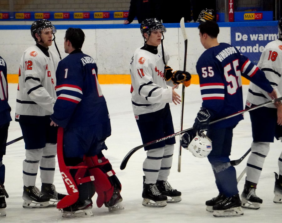Meteen van de start een barrage op het Thaise doel. Joey Oosterveld´s schot is het prooi van de keeper. Via diezelfde keeper en de paal gaat een schot van Bartek Bison naast. Dan aan de andere kant een slordigheidje van Kilian van Gorp. Hij levert in bij #14 Nicholas Charles Lampson. Maar die schiet gelukkig voorlangs. Dan een niet zo hard geschoten maar wel goed gericht schot van de blauwe lijn van Jordy Verkiel. De puck verdwijnt in de linkerbovenhoek voor de 0-1 na 3.23. Een diagonale pass naar de rechterflank. Een schot van Jonne de Bonth en na 4.40 is het 0-2. Daarna duurde het een hele tijd voor doelpunt nummer drie. Een grote verdienste van de Thaise doelman. Een straf tegen Floris van Elten, die de andere #21 Thananutch Kulthanthorn hinderde. Shorthanded stuit Reno de Hondt op de doelman. Maar even later komt hij vanachter het doel in de slot, schiet en scoort, 0-3 (12.06). Thailand heeft nog powerplay en een zeer goed schot van Papan Thanakroekkiat in de verre hoek en het is opeens 1-3 (13.11). Op 15.14 markeert Guus van Nes de 1-4 en meteen op de volgende aanval verhoogt Bartek Bison tot 1-5 (15.23). Geheel ongehinderd kan Diego Hofland door het centrum opstomen. Hij kan de hoek uitzoeken en zorgt voor 1-6 (17.06).