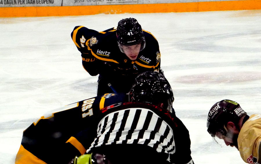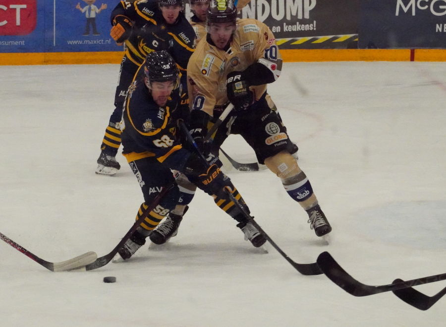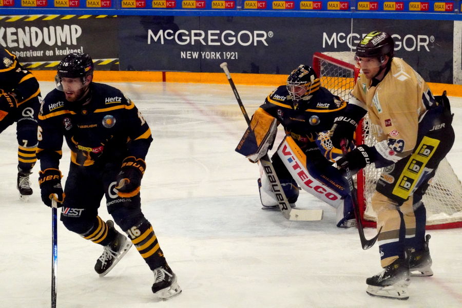 In de tweede periode merkt ook Noah Muller dat hij een doelverdediger van formaat tegenover zich heeft. Een lelijke charge aan de boarding van Alex Großrubatscher tegen Wouter Sars. Gelukkig staat Wouter snel weer op. Maar ook Alex Großrubatscher staat snel op. Wel uit de strafbank om de kleedkamer op te zoeken. Een vijfminuten boarding straf en een game misconduct voor de verdediger van de eerste lijn. Ook Jonne de Bonth krijgt een straf (roughing). Hij kwam met zijn vuisten verhaal halen bij Großrubatscher. Bij vier tegen vier komen de senioren van DSC op het ijs. Röthke, Leinweber en Greilinger maken het Cedric Andrée knap lastig. Maar de doelverdediger geeft geen krimp. Op 29.58 loopt Max Hermens tegen een interference straf op. Kilian van Gorp onderscheidt zich bij het doden van de straf. Twee opeen volgende straffen tegen DSC leveren vuurwerk op van Giovanni Vogelaar, Jonne de Bonth en Max Hermens. Maar DSC is het dichst bij een doelpunt als Cedric iets minder handig optreedt achter het doel. Maar de Canadees Carter Popoff kan niet scoren. In de tegenaanval geeft van de rechterflank D'Artagnan Joly diagonaal voor op Giovanni Vogelaar op links. Met een grandioze 'one-timer' lukt Gio de 2-0. Een powerplay doelpunt na 36.12. En net voor de tweede pauze een slapshot van de blauwe lijn van het midden van het ijs van Giovanni Vogelaar. En weer scoort hij. 3-0 na 39.28.