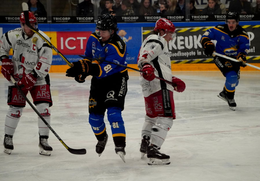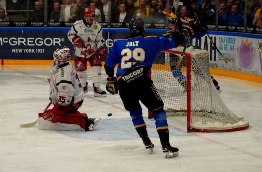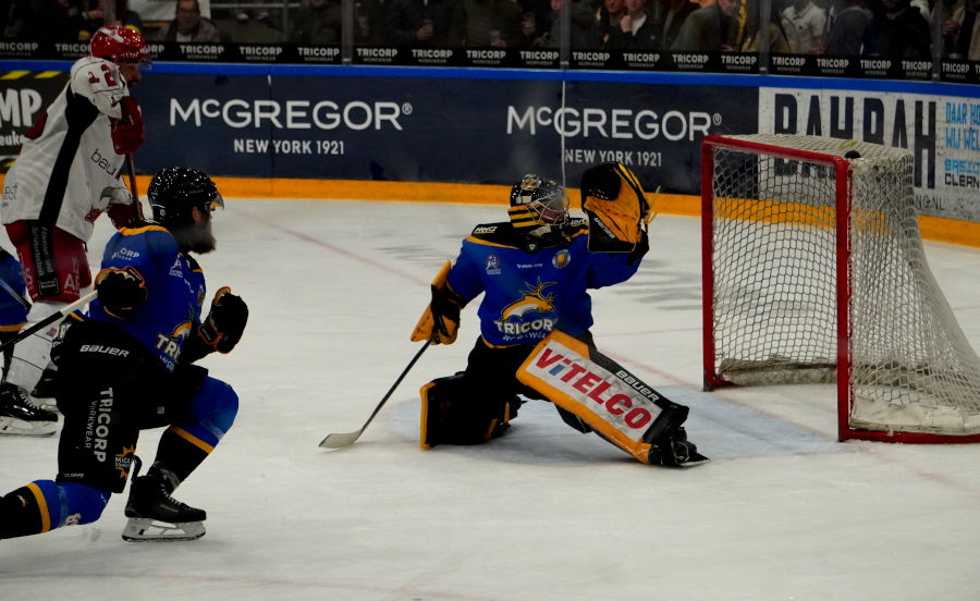De eerste tien minuten waren voor de Trappers. Ook al had ik net van tevoren te horen gekregen dat Tilburg de eerste periode notoir slecht uit de startblokken kwam dit seizoen. Maar ditmaal was de thuisploeg klaar wakker. Ook al ging een schot van Marvin Timmer net voorlangs en lukte het D'Artagnan Joly net niet bij de verre paal een pass van de linkerflank van Max Hermens te verzilveren. Maar na zo'n minuut of tien bedachten de Duitsers, Canadese Duitsers en Canadezen zich dat ook zij een leuk potje konden ijshockeyen. Een splijtende pass door het midden van Brett Cameron op Allan McPherson en Allan gaat alleen op Cedric af. Maar de Tilburgse sluitpost blijft fier overeind. Als Kilian van Gorp moet brommen voor elbowing wordt het allemaal nog benauwder. Scorpions vallen hevig aan. Maar de penalty killers - eerst D'Artganan Joly, Mike Dalhuisen, Phillip Marinaccio en Bjorn Borgman en later Ties van Soest, Jay Huisman, Giovanni Vogelaar en Jordy Verkiel - doen goed hun best. En beter nog doet Cedric Andrée het met weergaloze reddingen. Dan is er gefluit omdat het publiek een offside constateerde. Maar de linesmen floten niet af. En juist op die aanval scoort Hannover middels de Canadees met Duitse licentie Jordan Knackstedt, 0-1 (19.00). Een fluitconcert van de tribune vanwege de vermeende offside.