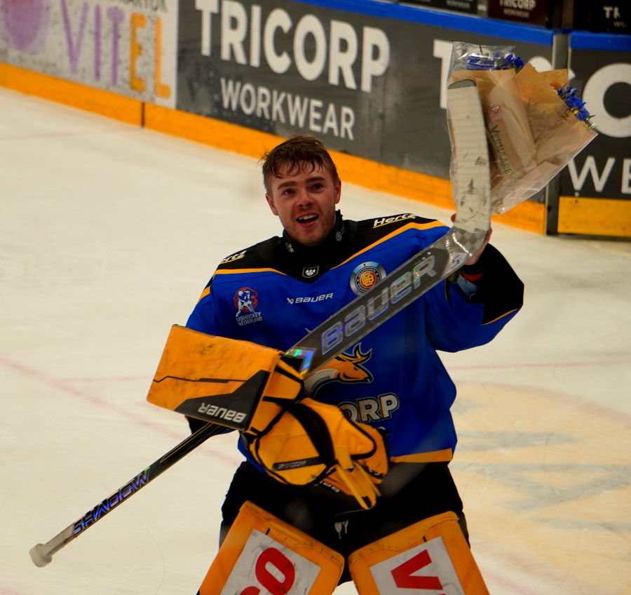 Na een korte pauze volgt de verlenging van vijf minuten, waarbij de ploegen elk drie veldspelers mogen opstellen. Trappers start met Bjorn Borgman, Phil Marinaccio en D'Artagnan Joly tegen Aaron Reinig,Dylan Wruck en Brett Cameron. Dan wisselen de ploegen. Kobe Roth, Reno de Hondt en Mike Dalhuisen staan dan tegenover Allen McPherson, Markus Eberhardt en Pascal Aquin. Eberhardt is dicht bij ene doelpunt. Terwijl Reno de Hondt de spelersbank opzoekt voert Max Hermens de puck. Hij schiet en Reich redt. Hij schiet. De puck ligt dan tussen de schaatsen van verdediger Alexander Heinrich. De voor Reno op het ijs gekomen Ties van Soest ziet de puck en vallend scoort Ties het wedstrijd winnnede doelpunt voor 5-4 op 61.15. Wat volgt is een stormloop van het team op Ties. Hij wordt bekant geplet tegen de boarding. Later volgt de uitreiking van de bloemen aan de Man-of-the-Match. De spreker zegt het al, jullie weten natuurlijk al wie het is. En ja, de heroïsche daden van Cedric Andrée worden beloond. Uitvoerig bedanken de spelers het publiek. En zelfs volgt er nog een 'Allemaal links...allemaal rechts' dansje op het inmiddels iconische Snollebollekes lied. Nadat het team het ijs heeft verlaten komen nog tweemaal groepjes spelers op het ijs om het feest van het verslaan van de oppermachtige Hannover Scorpions samen met het publiek te vieren.