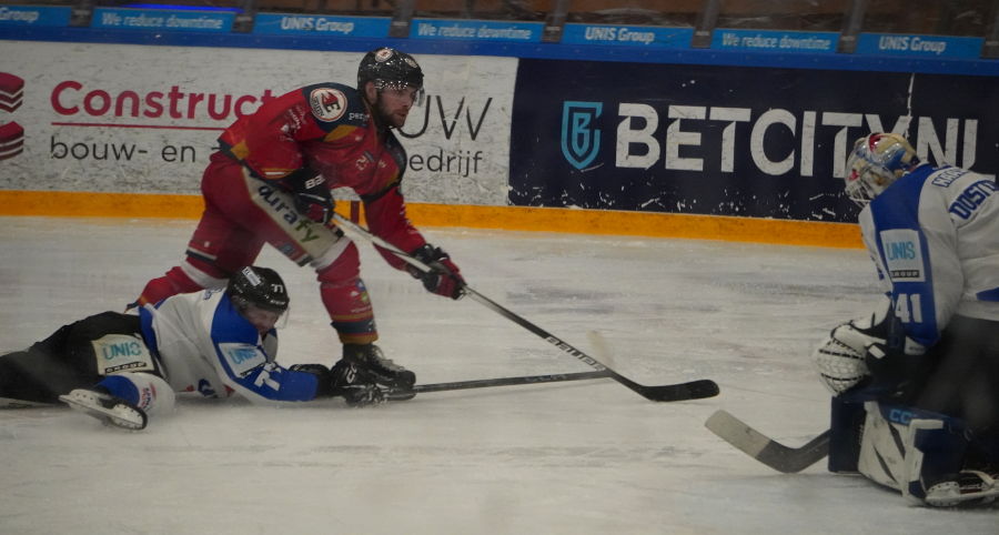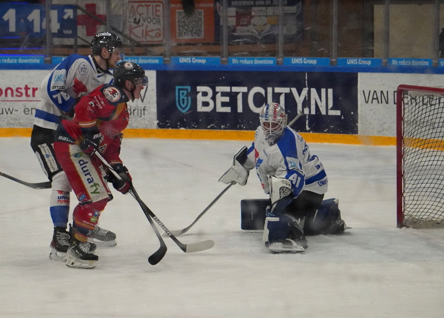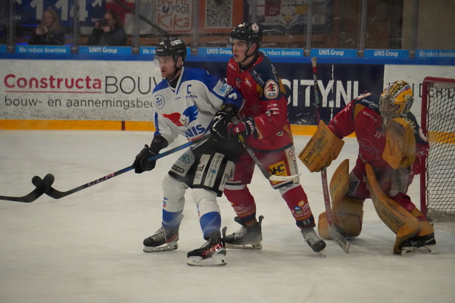 Maar na de pauze heeft Heerenveen slechts 11 seconden nodig om te scoren. Aanvoerder Jasper Nordemann was de schutter. Dat laten de Eaters er niet bij zitten. Maar het polsschot van Bradley Forrest gata net naast. En doelwachter Martijn Oosterwijk is alert als Tijn Jacobs Akim Ramoul bij de verre paal aanspeelt. Snel lateraal bewegen van Martijn en hij onderschept het schot van Ramoul. Ook zegt Martijn halt tegen een solo van Jordan Steinmetz. Een scherpe voorzet van Rens Aberson van de linkerflank naar de doelmond is een spekje naar het bekje van Jasper Nordemann. En na 29.17 is de stand 4-2. Aan de andere kant ligt de puck na de derde rebound in het kooitje van Oosterwijk. Maar scheidrechters Brian van Rijzewijk en Ramon Sterkens keuren het doelpunt af. Tot grote vreugde van de talrijke Heerenveen fans. Want Thialf was zeer goed bezocht. Waarbij het Geleen vak wat magertjes was bezet. Tijn Jacobs manouvreert zich met de puck in kansrijke positie. Frits Doop stopt hem met een slashing. Uiteraard moet Frits op de strafbank nadenken over zijn zonde. Diezelfde Tijn Jacobs lukt dan het powerplay doelpunt voor 3-4 (34.47). Net drie seconden voordat het krachtsspel is afgelopen gebeurde dat. Kort daarna betrappen de linesmen Geleen op het spelen met zes veldspelers. Akim Ramoul neemt vrijwillig plaats op de strafbank. Matteo Castronovo en de zijnen verdedigen geweldig en gunnen Heerenveen geen schot op doel. Vlak voor het scheiden van de markt schiet Eater Mike Collard net naast.