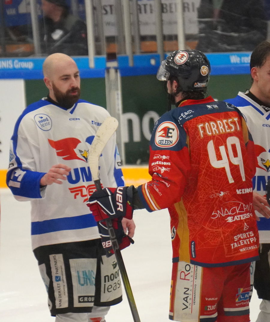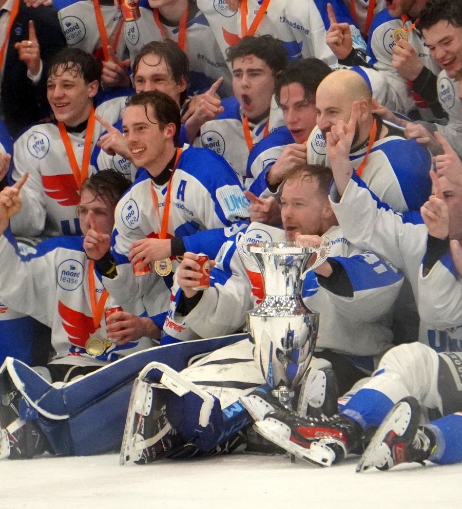 In het slotdeel geeft Tijn Jacobs Luka Mittendorff een forsde cross-check vlak bij de baording. Natuurlijk moet Tijn daarvoor twee minuten boeten. Ditmaal is de powerplay van Flyers beter verzorgd. Bij twee aanvallers op twee Geleen verdedigers glijdt één van de verdedigers onderuit. Een diagonale pass op Tony Demelinne en baardmans scoort de 3-5 (46.54). Met het breekijzer lukt het Geleen niet om het bolwerk van Heerenveen te slopen. Zo kan Wouter Sars met zijn schot niet Oosterwijk verschalken. Ook Jeffrey Melissant strandt op Martijn. In de slotminuten loopt Jordan Steinmetz tegen een high sticking straf op (57.08). Tja, en dan slinken de kansen voor Geleen. In de slotminuut dan een twee op één aanval. Op rechts voert Jay de Ruiter de puck. Hij passt diagonaal op Tom Speel. Die de puck direct op doel schiet en scoort, 3-6 (59.17). De vreugde en ontlading van Tom vertelt alles. Flyers Heerenveen zijn kampioen van Nederland 2024-2025. Doug Mason reikte de ondeerscheiding voor de Meest Waardevolle Speler uit aan Jasper Nordemann. Niets ten nadele van Jasper, maar mijn MVP was zonder twijfel Frits Doop. Zeker een uur na afloop waren nog spelers op het ijs het behalen van het kampioenschap te vieren. Teruglopend naar het station hoorde ik luid gejuich uit de Abe Lenstra Stadion. Kennelijk had de plaatselijke SC gescoord. Alles OK dus in het Friese Haagje.