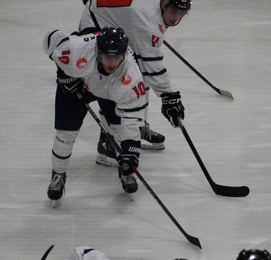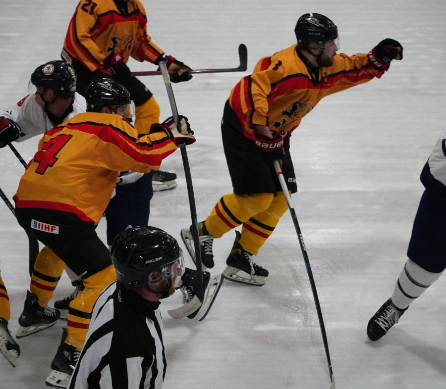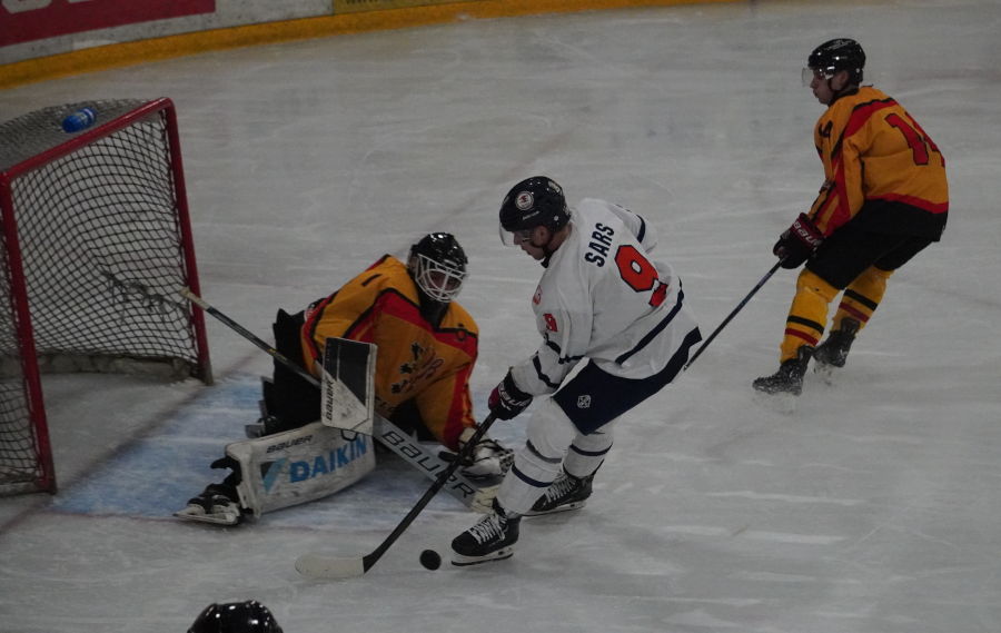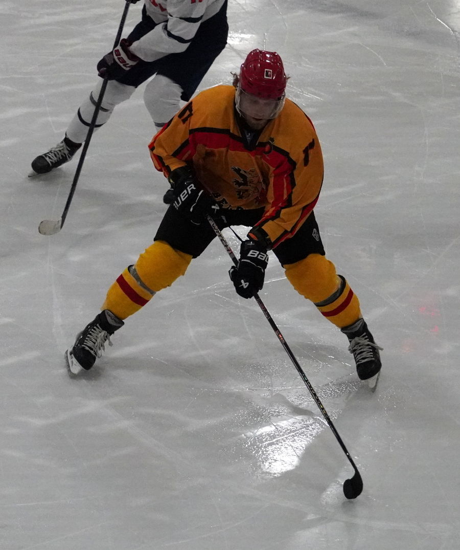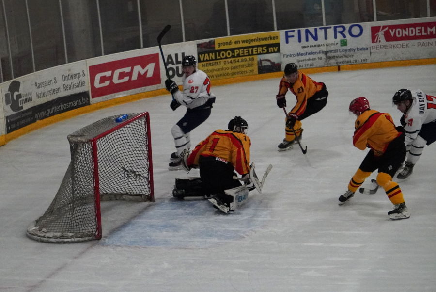 Oeps. Vlak voor aanvang van de klassieker België tegen Nederland tel ik slechts 19 bezoekers. Maar gelukkig komen in extremis nog toeschouwers toestromen. Officieel bezoekers aantal kwam op 136 personen. Waaronder oud-international Danny Geysbreghs, die natuurlijk kwam supporteren voor zijn zoon Vadim. Er was al aangekondigd dat de Nederlandse bondscoach Doug Mason wilde experimenteren. Het uittesten van een aantal jonge spelers. Zoals Nijmegen Devil Marat Korotchenko en de beide doelmannen. Aan Belgische zijde de Nederlandse hoofdcoach Jeffrey van Iersel en Nijmegen Devils coach Chris Eimers als zijn assistent. De startende doelman bij België was Jelle Lievens. De stergoalie van Chiefs Leuven. Mason koos de 18-jarige Danylo Douma (GIJS Groningen) als startende keeper. Het eerste blok van vijf bij Nederland bestond uit Rens Aberson, Finn van de Wiel en Guus van Nes in de aanval. En het Heerenveense backpaar Jelle Kronenburg en Frits Doop. Bij België zijn de Eaters Geleen spelers Lander Paulissen en Arne van Espen van de partij. De Belgen namen meteen het initiatief. Maar de schoten van Vadim Geysbreghs en Dries Blockx waren het prooi van Danylo. Een backhander van Van de Wiel ging maar net naast. Beide ploegen voerden het spel op hoog tempo. Maar echt goede doelkansen kwamen zelden. Geleidelijk aan veroverde Oranje een licht veldoverwicht. Daarbij testten Frits Doop en Joey Oosterveld doelman Lievens flink. Dan schaatst Joey Oosterveld achter het doel langs. Geeft dan achterwaarts een pass op de naast het doel geposteerde Marat Korotchenko. En Marat kaatst de puck hoog in de korte hoek, voordat Jelle goed en wel lateraal had kunnen bewegen om de hoek te dekken. 0-1 na 13.16. Korte tijd later loop verdediger Wesley de Bruijn tegen een cross-check straf op (14.14). De gevaarlijke schoten van Mathijs Lievens en Dries Blockx verdwijnen beide in de vanghandschoen van Danylo Douma. Voor de eerste pauze dan alleen nog een goed backhandschot van Rens Aberson, waarbij Lievens de puck keert met zijn blocker.