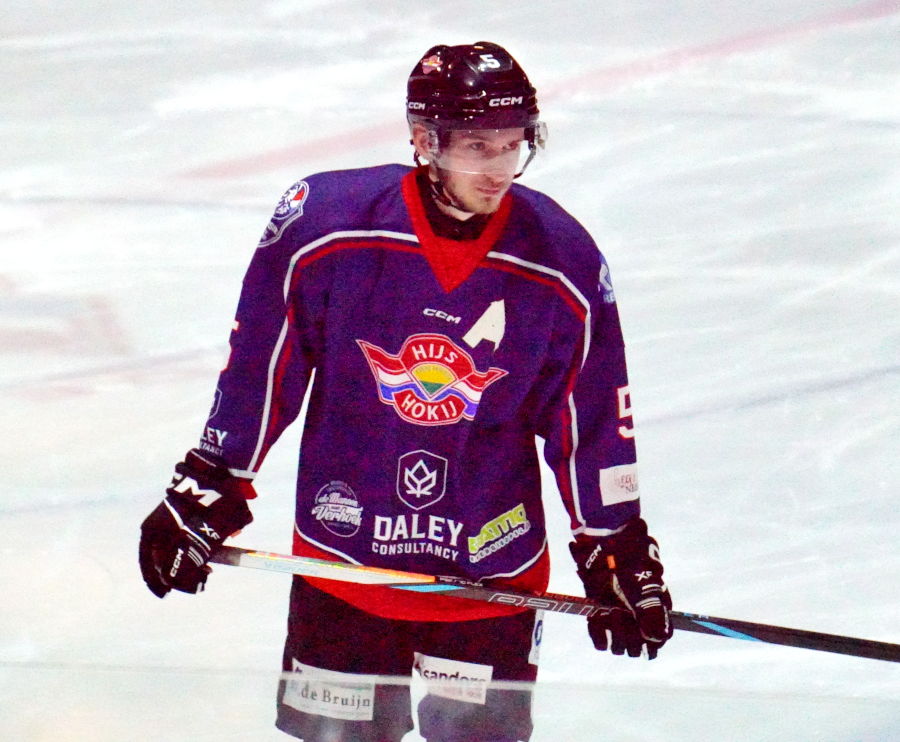 Tommy van Zanten, linkervleugel van HIJS HOKIJ Den Haag Eredivisie In de slotperiode verdwijnt Carsten Smit al rap naar de strafbank. Op de powerplay komt Niels Hupkes vanaf de blauwe lijn. De puck is het prooi van de vanghandschoen van Almer de Boer. Na de powerplay schiet Tudor Nechita op de paal. Met dit wapenfeit kwam HIJS het dichtst bij een doelpunt. Een polsschot van Valtteri Mäkiviinikka en het is 0-4 na 48.21. Nadat Tommy van Zanten in de vanghandschoen van De Boer schiet gaat verdediger Behrend Piket in de fout. De bij de verre paal geposteerde verdediger Valtteri Mäkiviinikka weet dan tijdens de powerplay de pass van Niko Kuivaniemi te verzilveren voor 0-5 (53.27). Overigens wordt op de wedstrijdsheet Niko als doelpuntenmaker aangegeven! En daarmee was de wedstrijd wel zo'n beetje gespeeld. Almer de Boer legt zijn kooitje plat. Een shutout gerealiseerd. Einde seizoen voor het Eredivisieteam van HIJS HOKIJ Den Haag. Terwijl GIJS met het verlies van Zoetermeer en eigen winst zich verzekerde van de zesde plaat in de eindrangschikking en zich kan opmaken voor de kwartfinale Play-Offs serie tegen Dragons Utrecht.